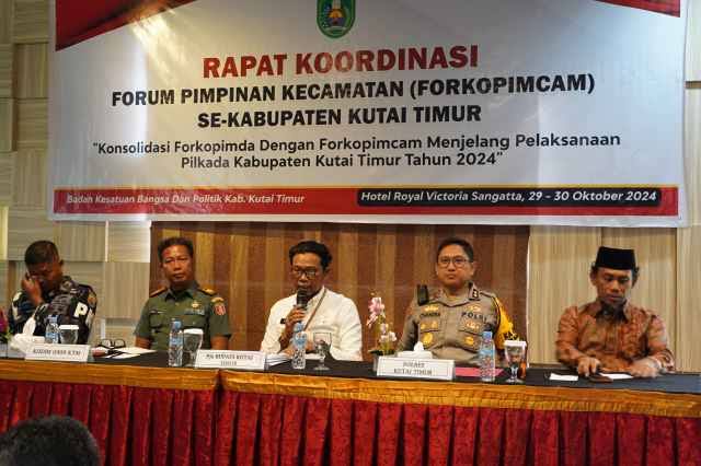Dalam rangka persiapan menghadapi Pilkada 2024, Pemerintah Kabupaten Kutai Timur (Pemkab Kutim) menggelar Rapat Koordinasi (Rakor) Forum Pimpinan Kecamatan (Forkopimcam) di Hotel Royal Victoria, Sangatta, pada Rabu (30/10/2024). Acara bertema “Konsolidasi Forkopimda dengan Forkopimcam Menjelang Pelaksanaan Pilkada Kabupaten Kutai Timur Tahun 2024” ini bertujuan untuk memperkuat sinergi dalam mengantisipasi potensi kerawanan sosial yang mungkin terjadi sebelum dan selama pilkada.Rakor yang dipimpin oleh Penjabat Sementara (Pjs) Bupati Kutim, H M Agus Hari Kesuma (AHK), dihadiri oleh berbagai unsur pimpinan daerah, termasuk Ketua DPRD Kutim, Jimmy, Kapolres Kutim AKBP Chandra Hermawan, serta perwakilan dari Kodim 0909/KTM dan Lanal Sangatta. Hadir pula camat, kapolsek, dan danramil se-Kutim, serta Badan Kesatuan Bangsa dan Politik (Kesbangpol) sebagai inisiator acara.Pjs Bupati Kutim, Agus Hari Kesuma, menekankan pentingnya peran serta seluruh pihak dalam menciptakan suasana kondusif menjelang pilkada. “Setiap pihak harus meningkatkan perannya, memperkuat silaturahmi, dan menyatukan visi demi suksesnya Pilkada Kutim 2024. Meskipun ada potensi kerawanan, kami optimistis hal itu dapat diredam,” ungkapnya.Dalam rakor tersebut, Agus juga memetakan potensi kerawanan, termasuk distribusi logistik, peran penyelenggara, dan netralitas Aparatur Sipil Negara (ASN). Dia menegaskan bahwa ASN harus tetap netral, dan hal ini juga berlaku bagi TNI-Polri. Sinergi antara eksekutif, legislatif, dan yudikatif dianggap penting untuk memperkuat langkah antisipasi.Ketua DPRD Kutim, Jimmy, mengingatkan bahwa meskipun para legislator akan mendukung pasangan calon sesuai instruksi partai, netralitas sebagai pejabat daerah tetap harus diutamakan. “Kami memiliki kewajiban untuk memastikan pilkada berlangsung damai, terutama karena Kutim berbatasan langsung dengan Ibu Kota Nusantara (IKN),” ujarnya.Kapolres Kutim, AKBP Chandra Hermawan, melaporkan kesiapan aparat keamanan dengan melibatkan 414 personel Polres, ditambah 100 personel dari Polda dan 100 dari Brimob dan Samapta. Total, 429.640 warga dan 297.994 daftar pemilih tetap akan mengikuti pilkada. Setiap dua personel akan ditempatkan di tiap tempat pemungutan suara (TPS) yang berada di lokasi rawan untuk menjaga stabilitas.Rakor juga menghasilkan rekomendasi penting, termasuk penambahan polsek dan koramil di kecamatan yang minim fasilitas keamanan. Pjs Bupati juga merekomendasikan kepada Kapolda untuk merekrut personel kepolisian dari warga lokal, agar lebih dikenal dan diterima masyarakat. Agus berharap agar konsolidasi ini dapat dipertahankan dan semua Forkopimcam segera berkoordinasi dengan Forkopimda jika ada potensi kerawanan. Dengan berbagai langkah antisipatif yang diambil, seluruh pihak optimis bahwa Pilkada Kutim 2024 akan berlangsung aman. (Arn)